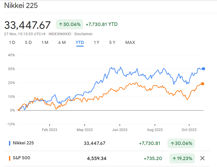 Year to date, the Nikkei 225 is also up significantly, even beating the S&P 500: